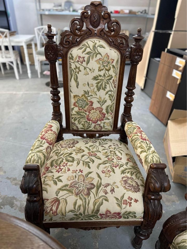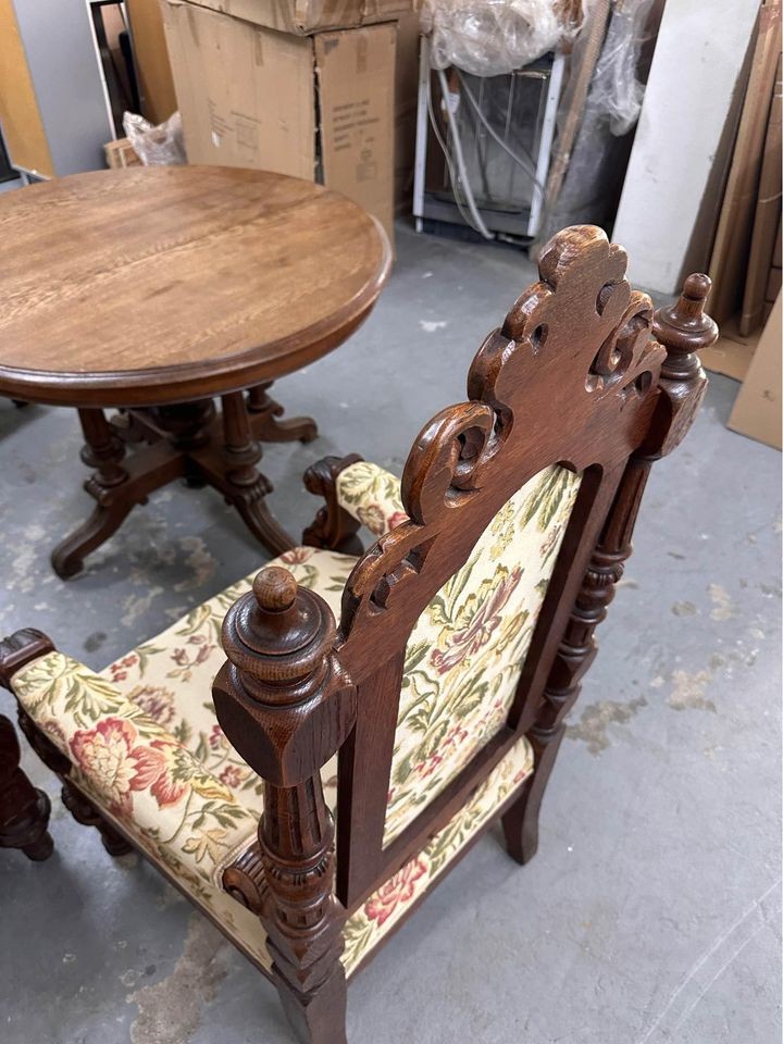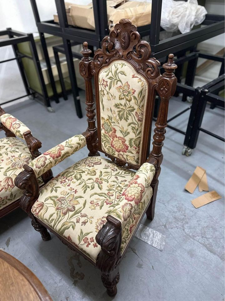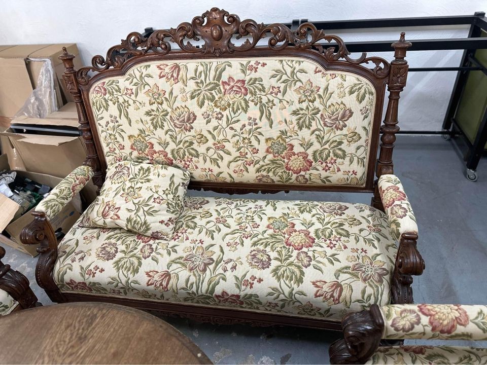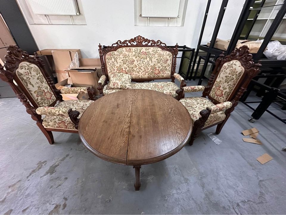 W skład ponad 100-letniego kompletu wchodzą: sofa, 2 x krzesło, stolik do kawy.