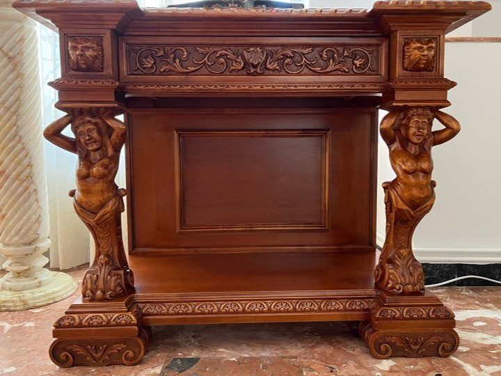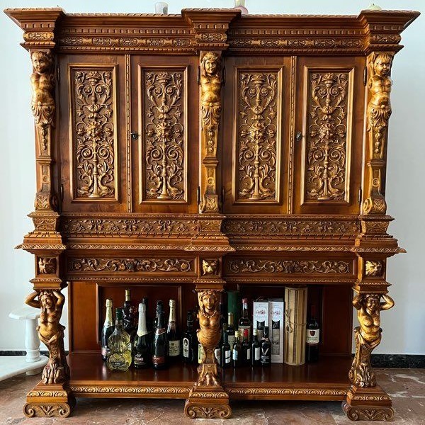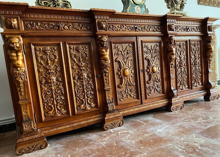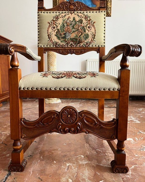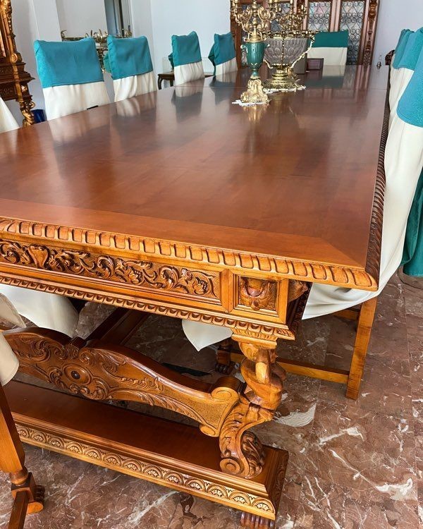 W skład kompletu z drewna chodzi: kredens/biblioteka, szafka, bufet, stolik, stół, 2 x fotel, 10 x krzesło.
