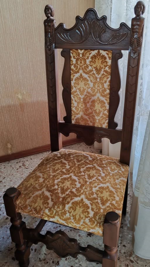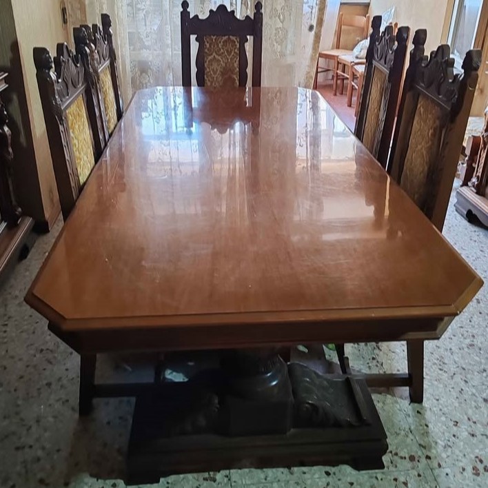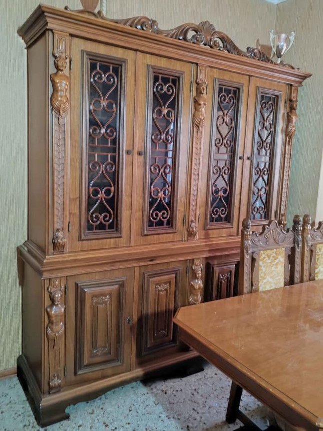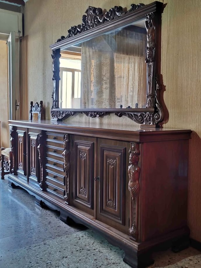 W skład kompletu wchodzi: kredens, bufet z lustrem, stół, krzesła.
