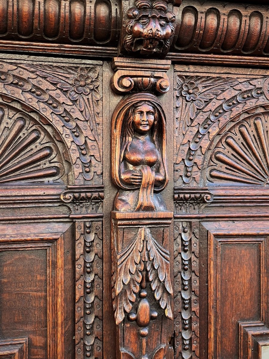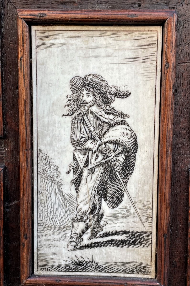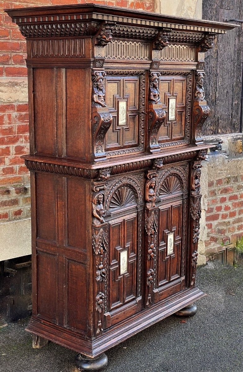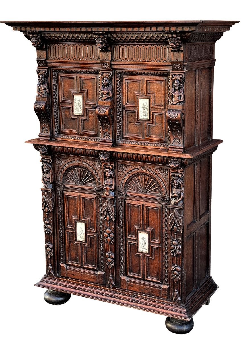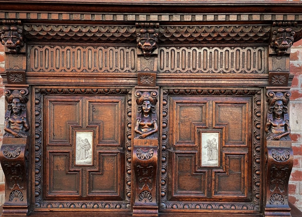 Rzeźbiony kredens z drewna dębowego w stylu renesansowym ozdobiony płytami z kości słoniowej, przedstawiającymi muszkieterów. Mebel posiada cztery drzwi.