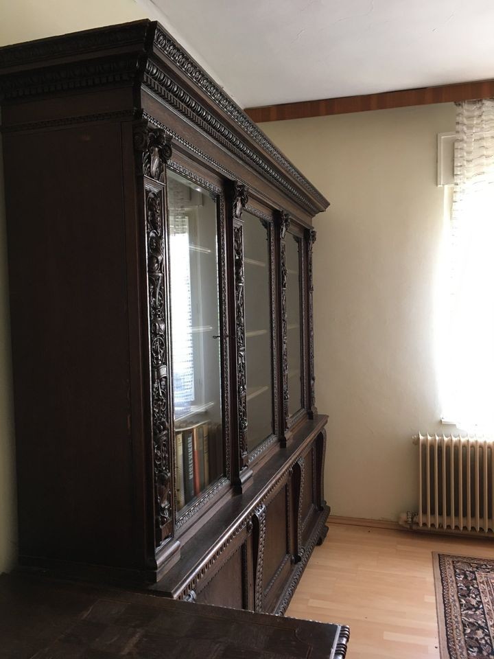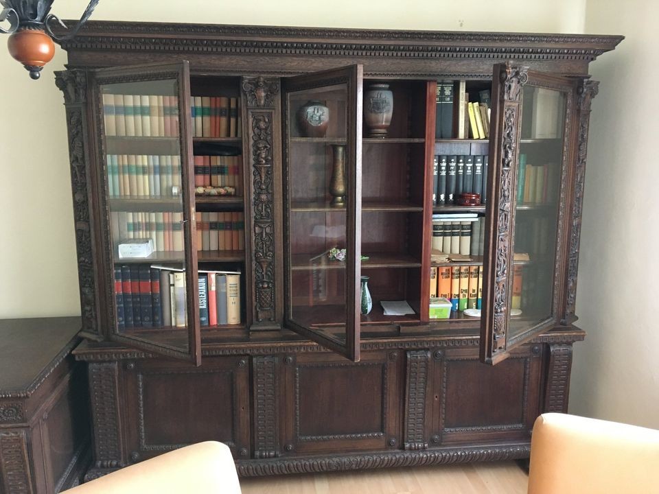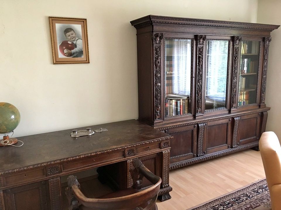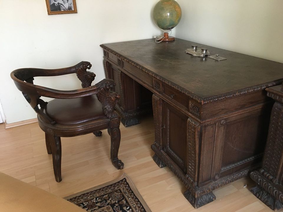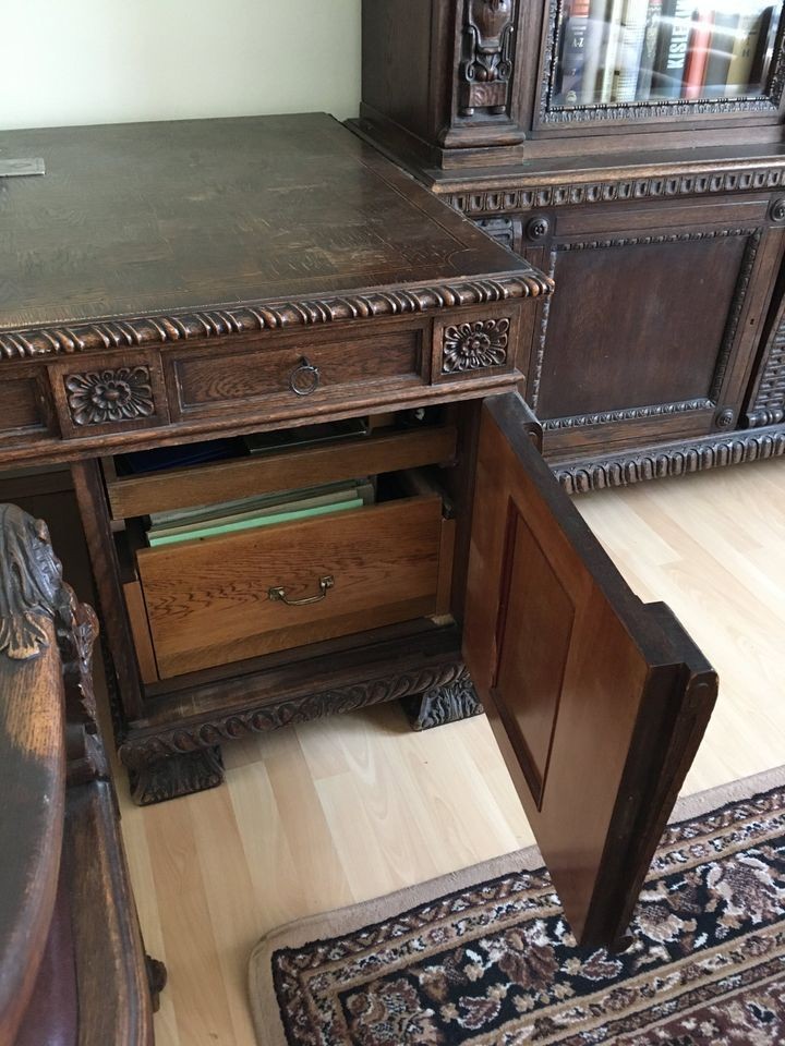 W skład rzeźbionego kompletu z drewna dębowego wchodzą: biblioteka, biurko, krzesło. W doskonałym stanie.