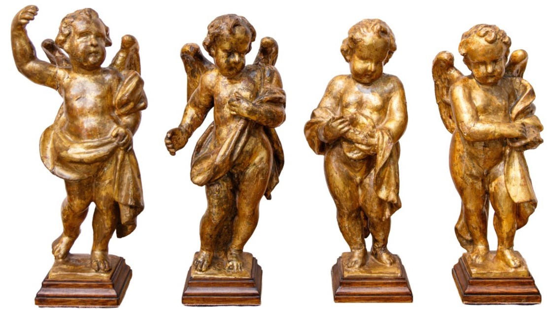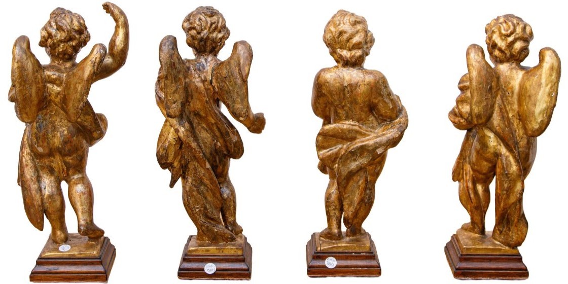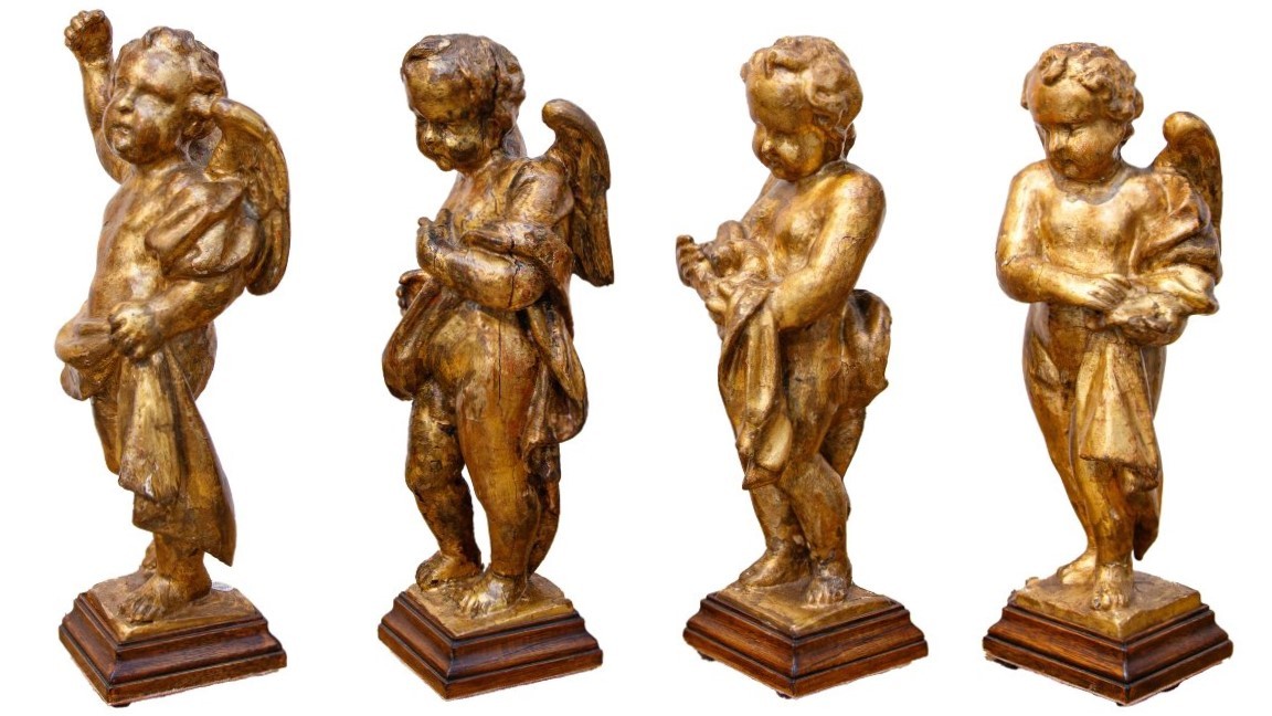 W skład kompletu z pozłacanego drewna wchodzi: 4 x putto.