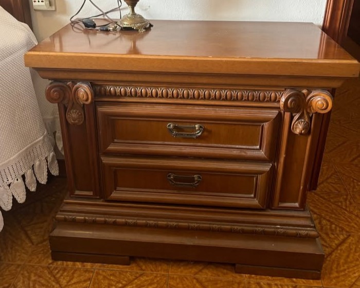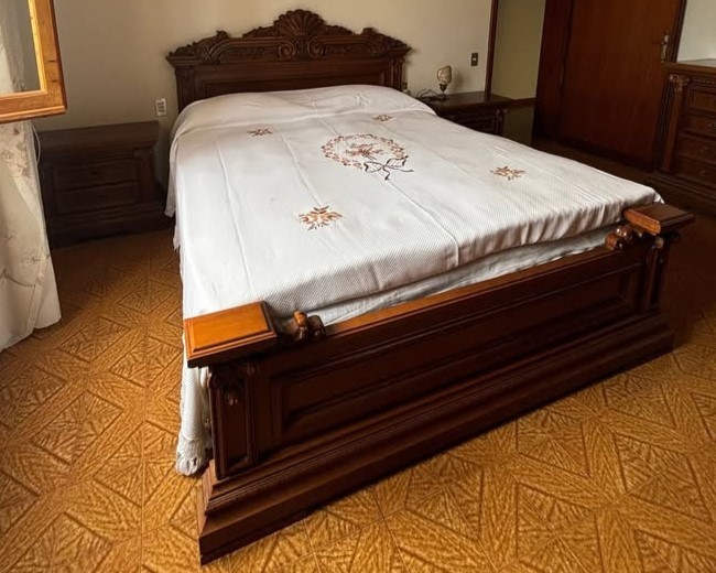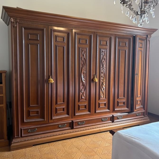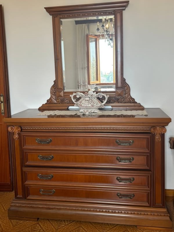 W skład kompletu z drewna wchodzi: łoże, 2 x szafka nocna, szafa, komoda z lustrem.