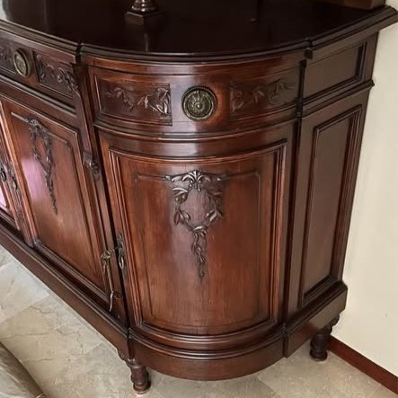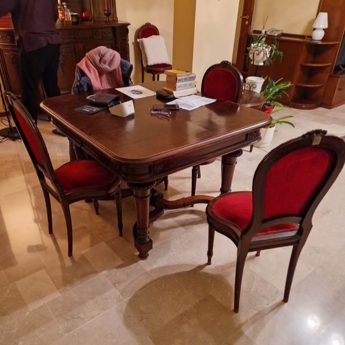W skład kompletu z drewna wchodzi: kredens, rozkładany stół, 6 x krzesło.