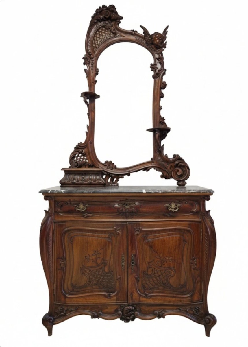 W skład kompletu z drewna orzechowego wchodzi: łoże, 2 x szafka nocna, szafa, biurko, komoda z lustrem.