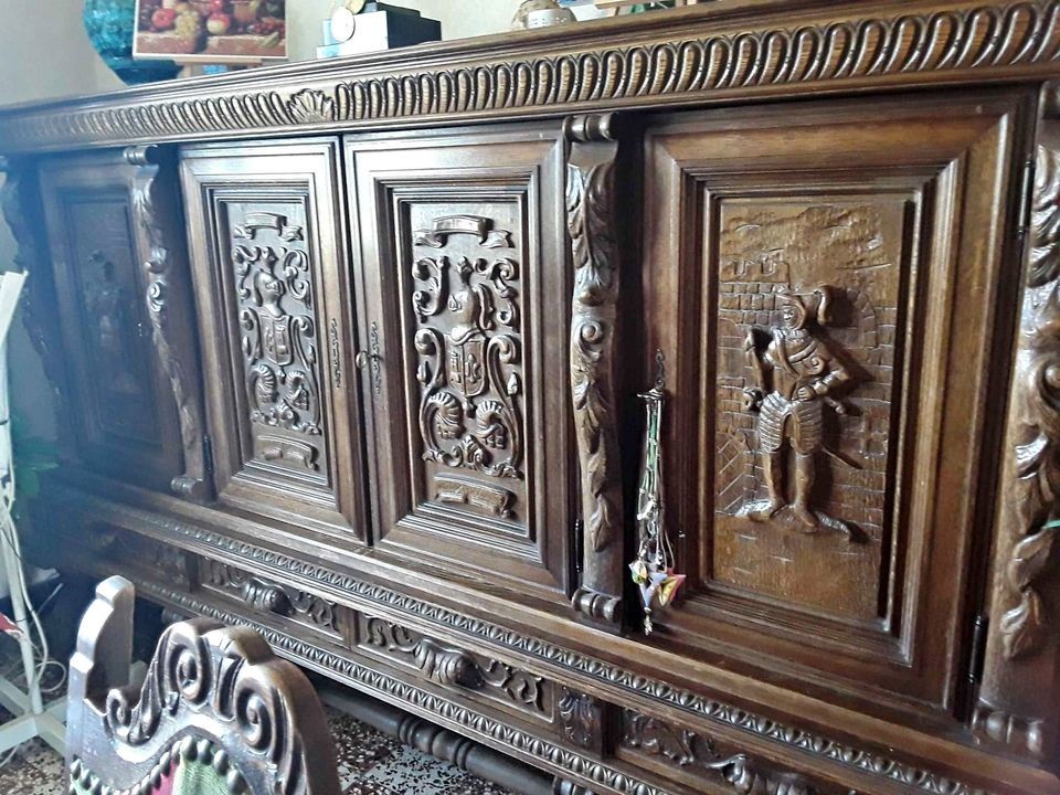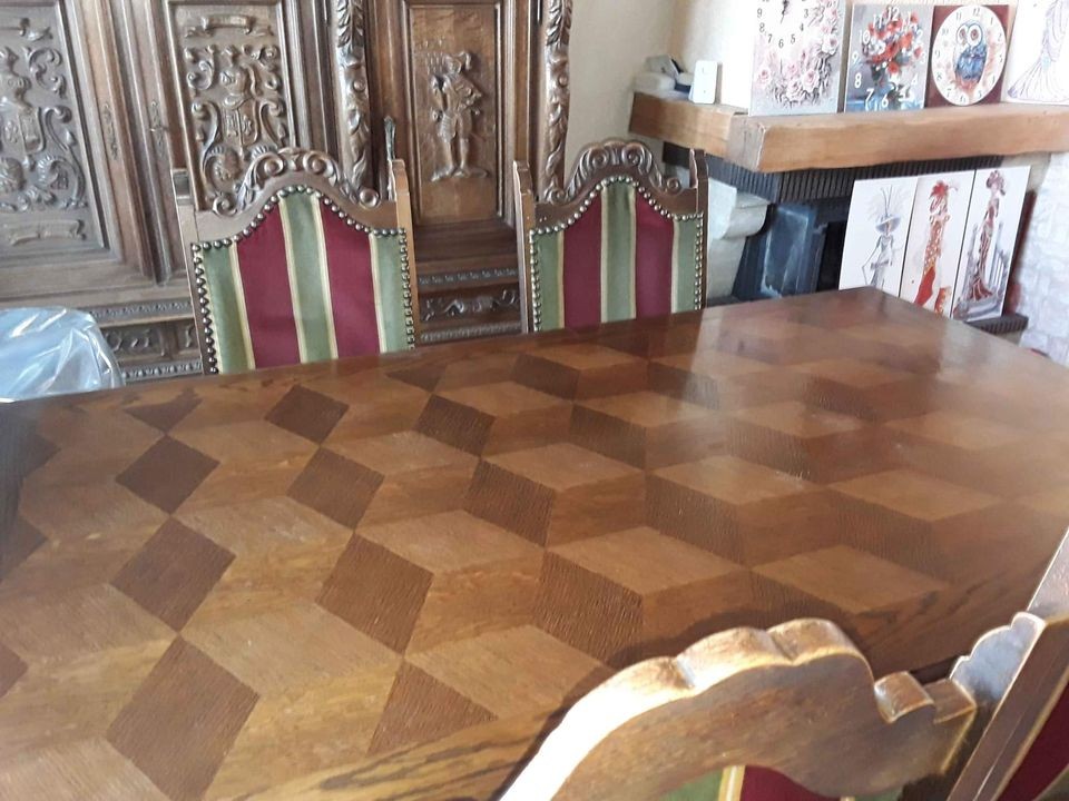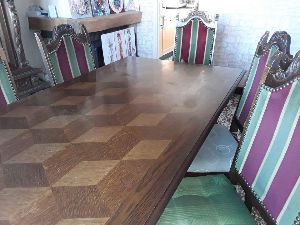 W skład kompletu wchodzi: szafka bufetowa, rozkładany stół, 6 x krzesło.