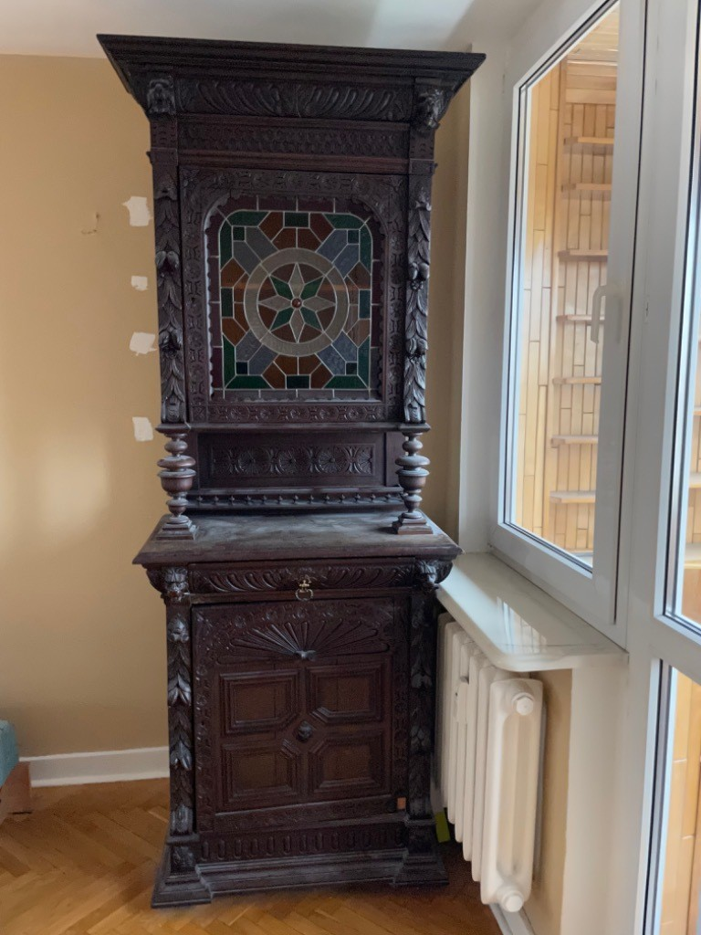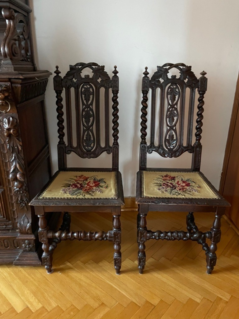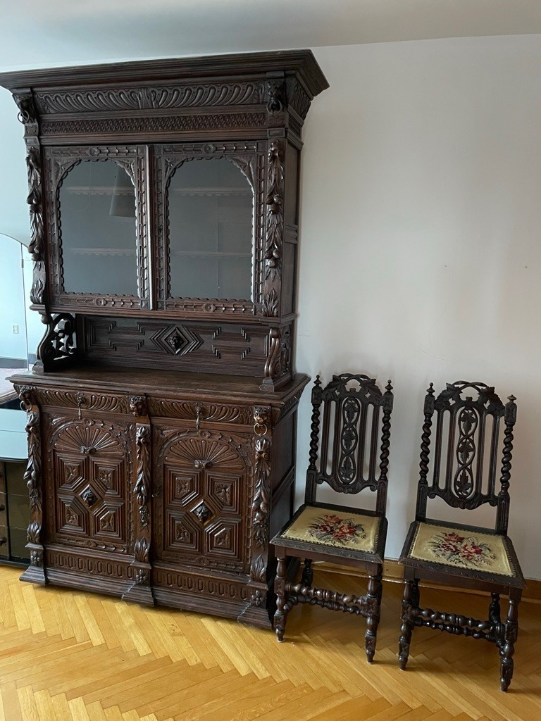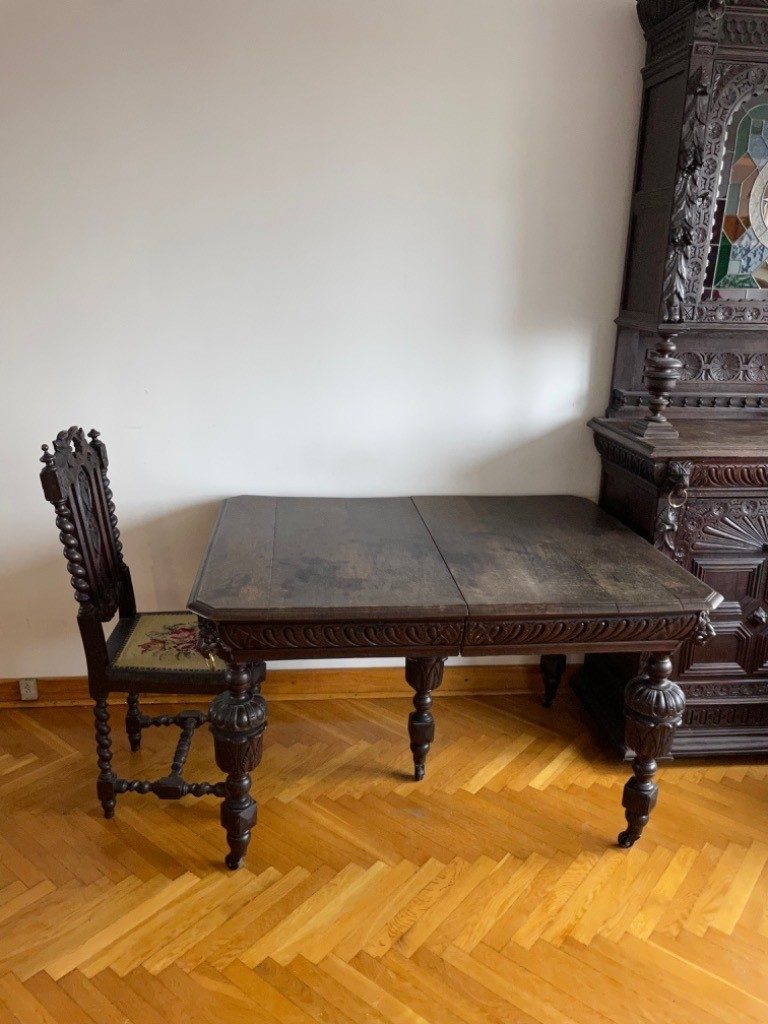 W skład kompletu wchodzą: stół, 3 x krzesło, 2 x kredens.
