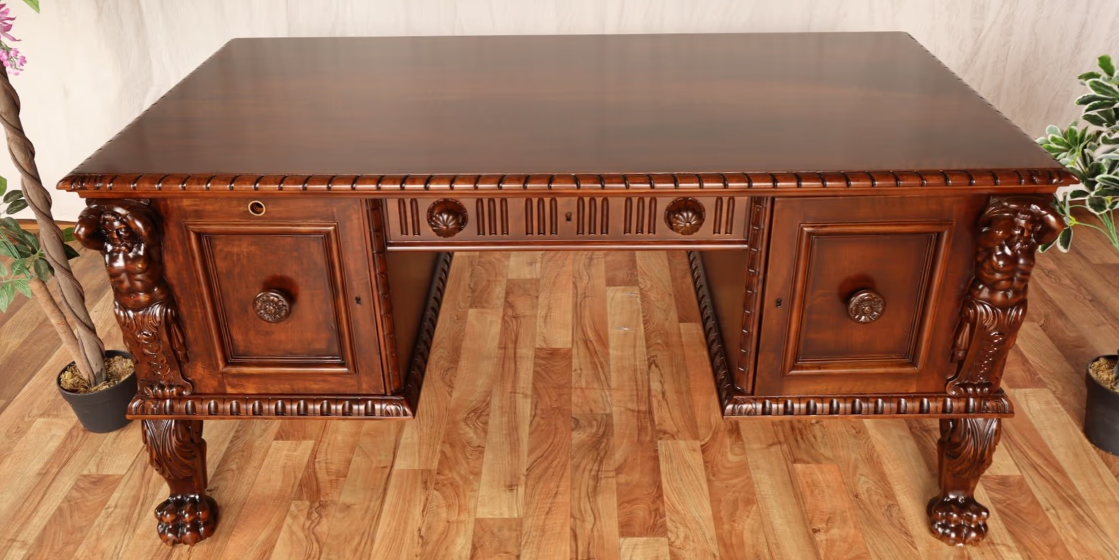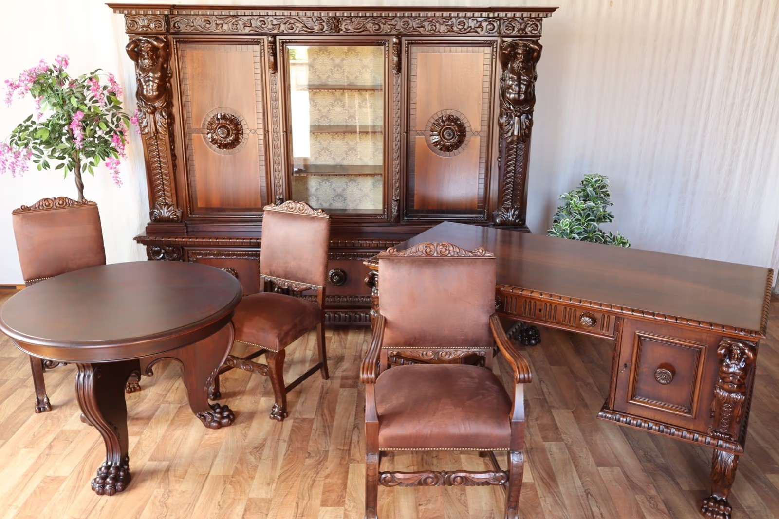 W skład kompletu z drewna orzechowego wchodzi: biblioteka, biurko, stolik, fotel, 2 x krzesło.