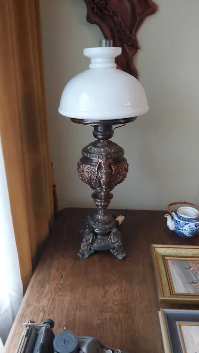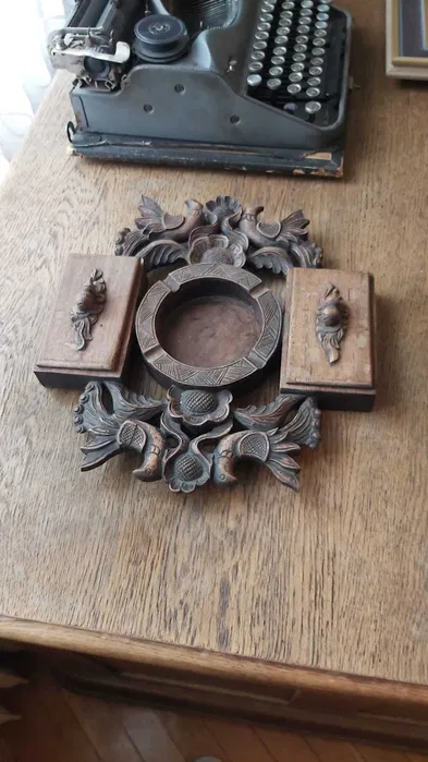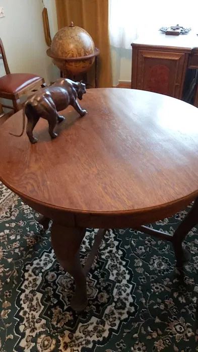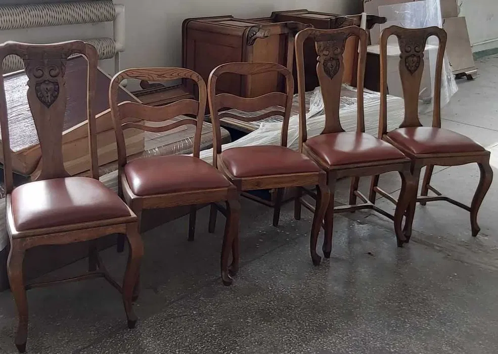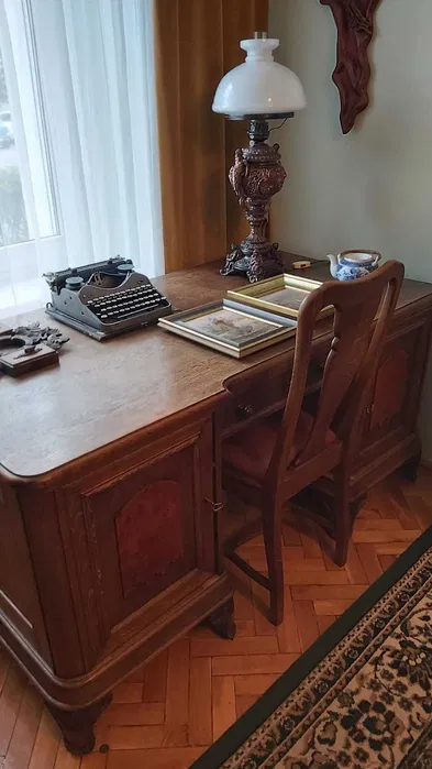 W skład zestawu wchodzą: biblioteczka, biurko, stół, 5 krzeseł (w tym 3 rzeźbione), lampa z brązu, żyrandol, drewniana popielniczka.