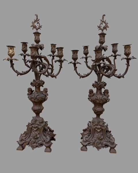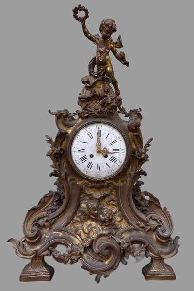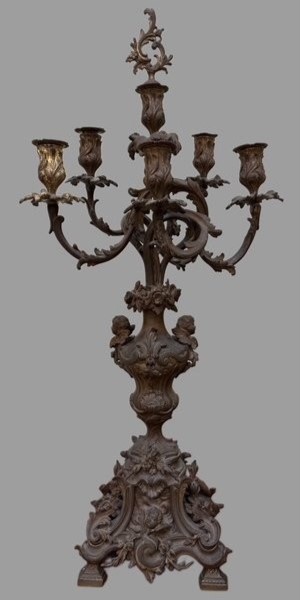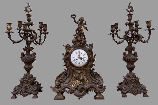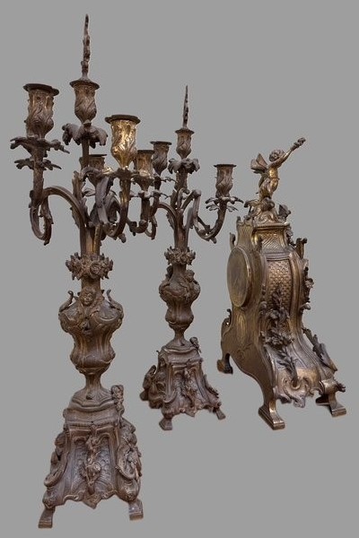 W skład kompletu z pozłacanego brązu wchodzi: zegar, 2 x kandelabr.
