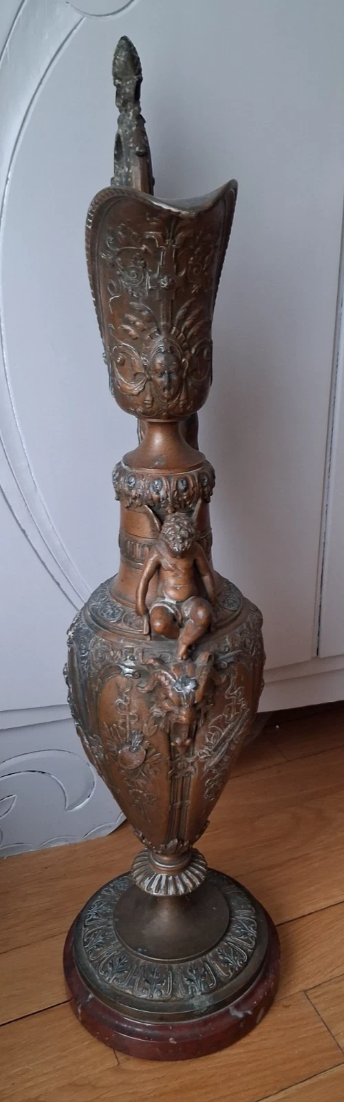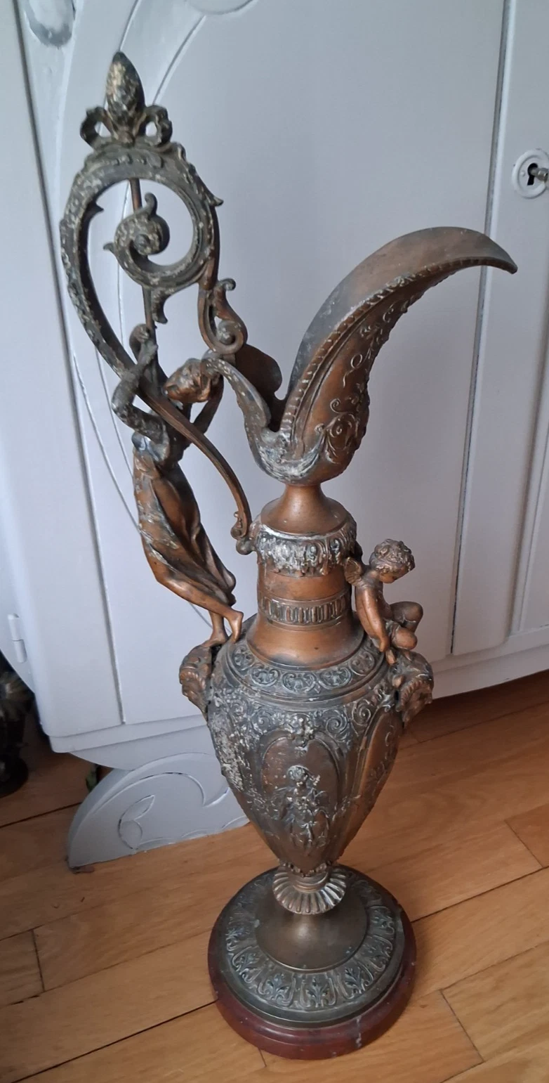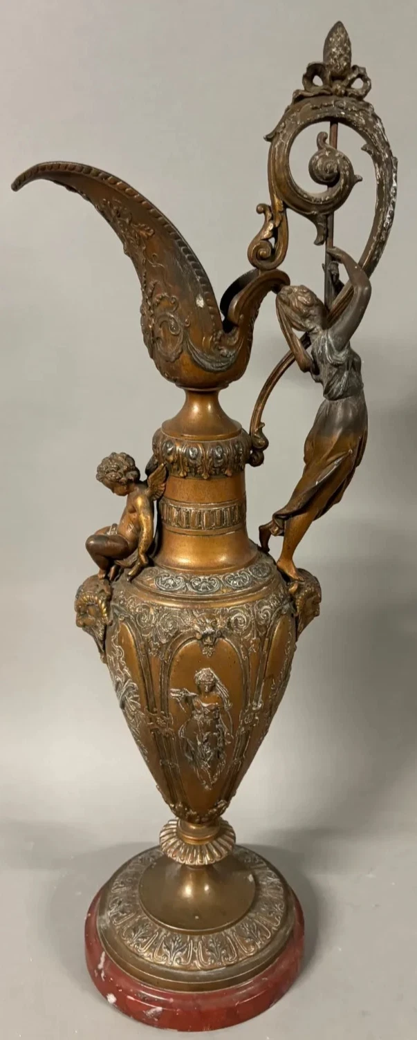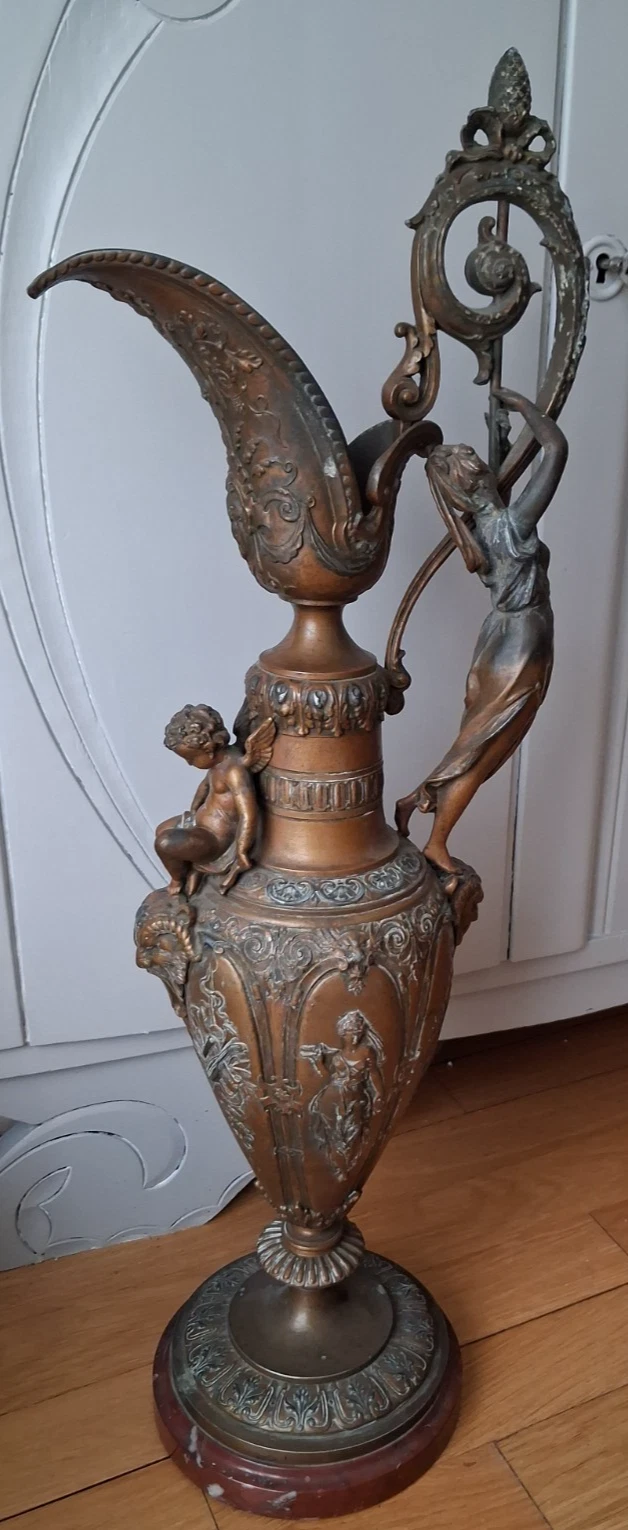 Wspaniały dzbanek w stylu renesansowym, regulowany, na marmurowym postumencie, pochodzący z XIX wieku. Ozdobiony wizerunkiem bogini muzyki oraz putto, stanowi wyjątkowy element dekoracyjny.