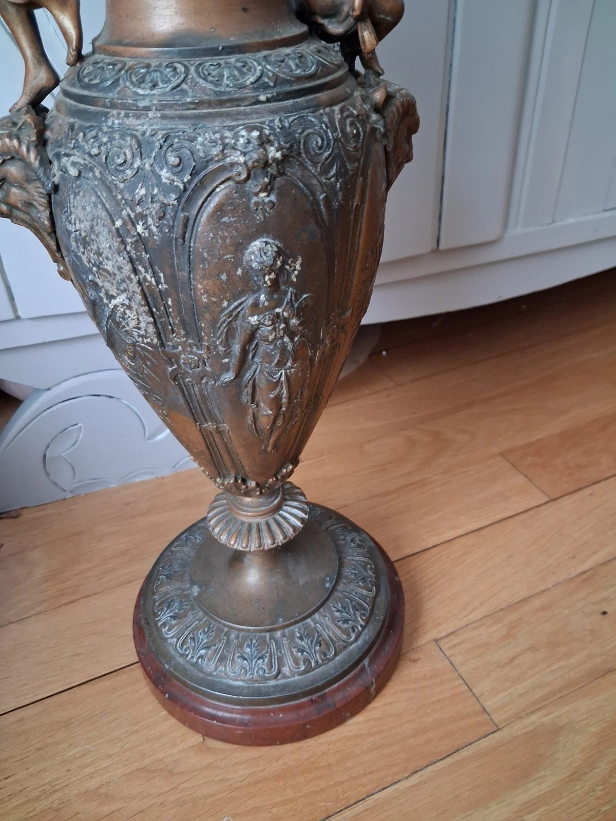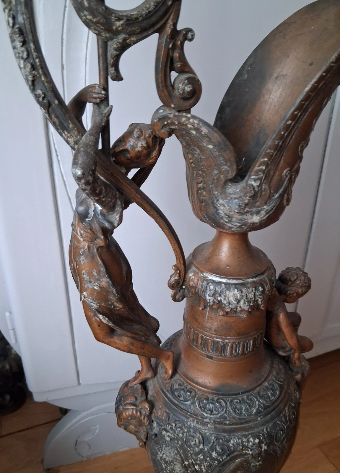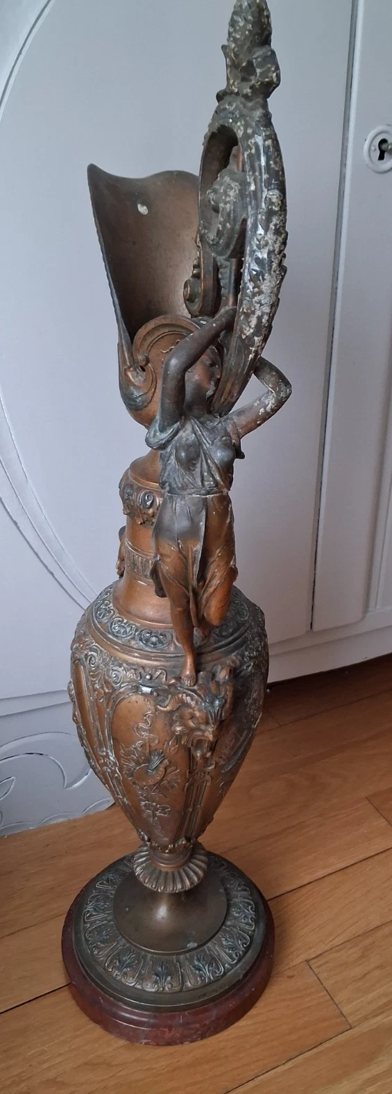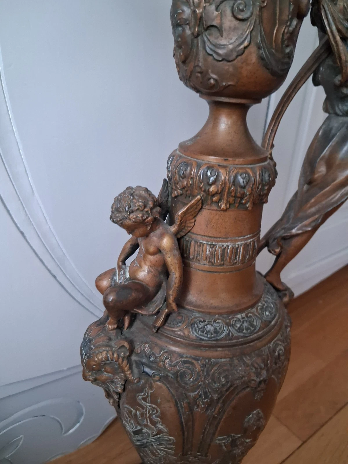 Wspaniały dzbanek w stylu renesansowym, regulowany, na marmurowym postumencie, pochodzący z XIX wieku. Ozdobiony wizerunkiem bogini muzyki oraz putto, stanowi wyjątkowy element dekoracyjny.