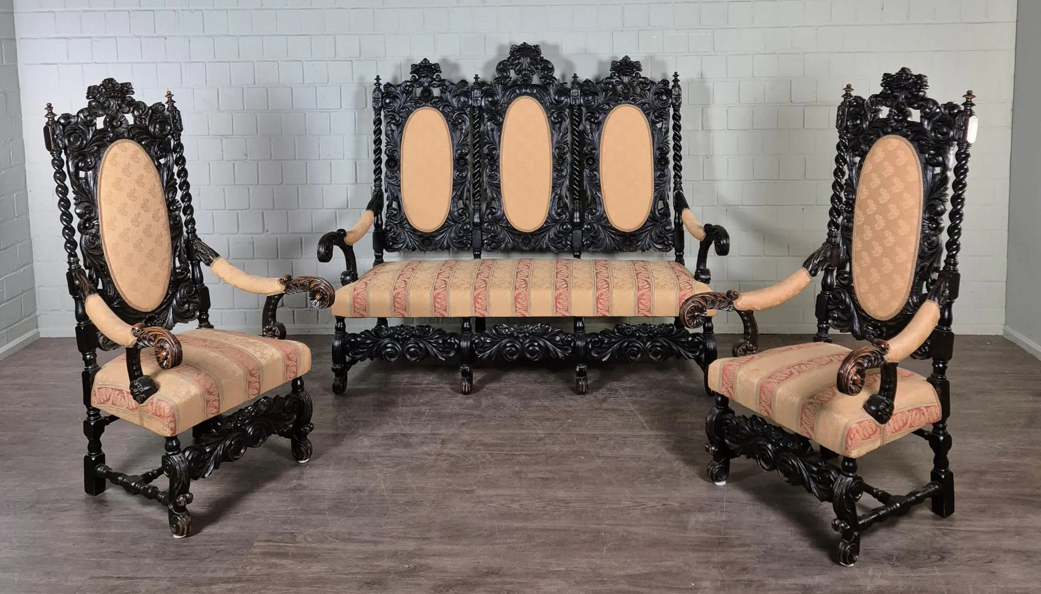 W skład kompletu z drewna dębowego wchodzi: ławka 3-osobowa, 2 x fotel.