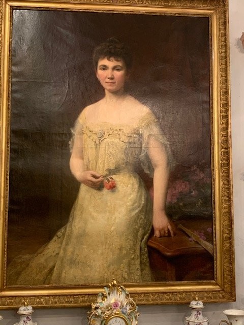 S3036 Dama z różą, Duży olej na płótnie, XIX w.
