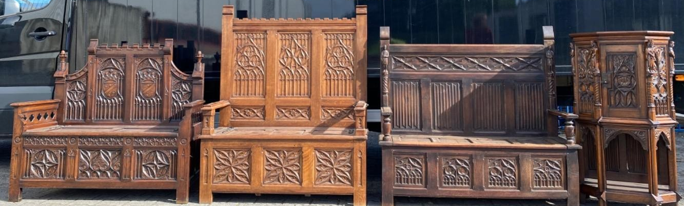 W skład kompletu z drewna wchodzi: 3 x ławka/skrzynia, szafka.